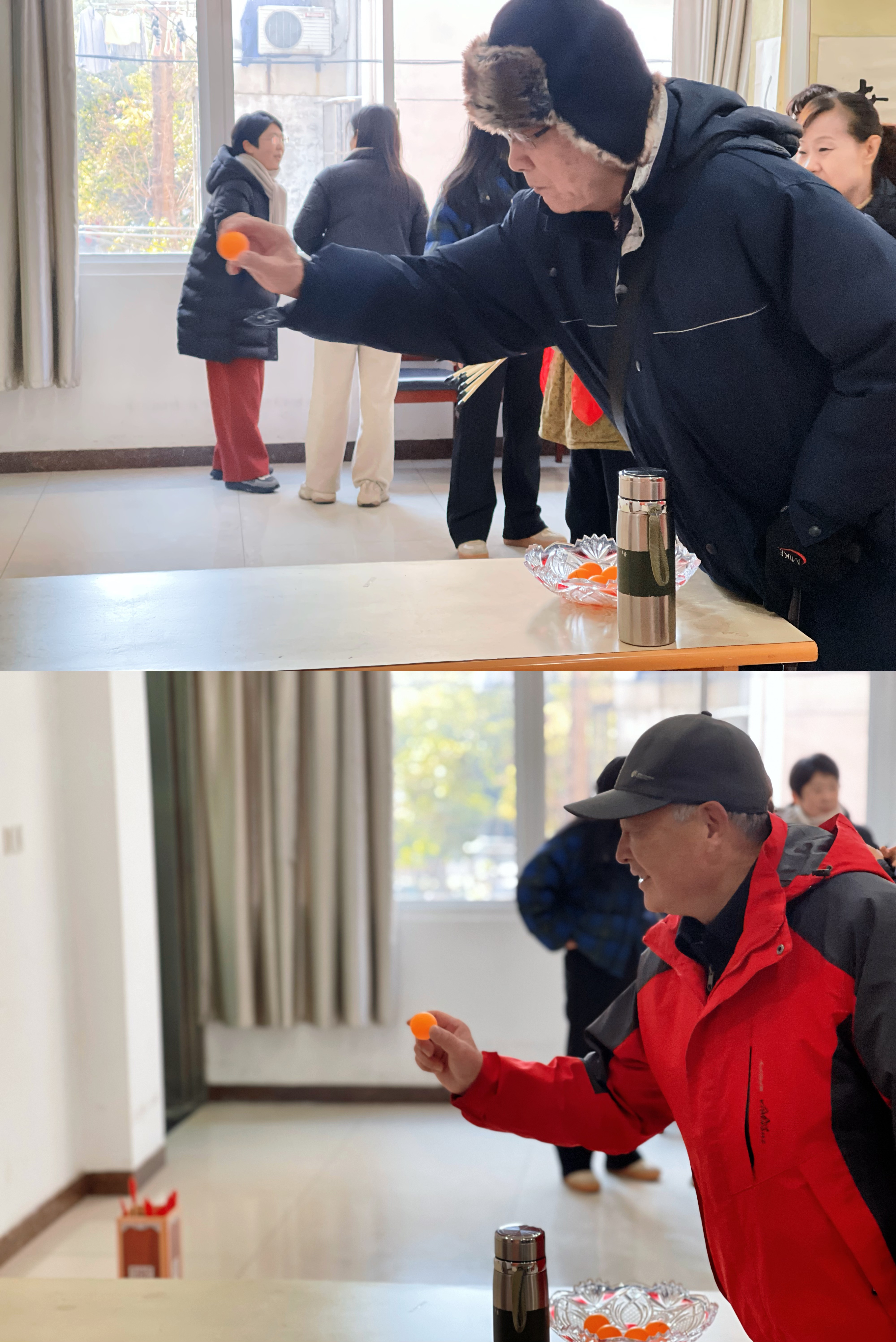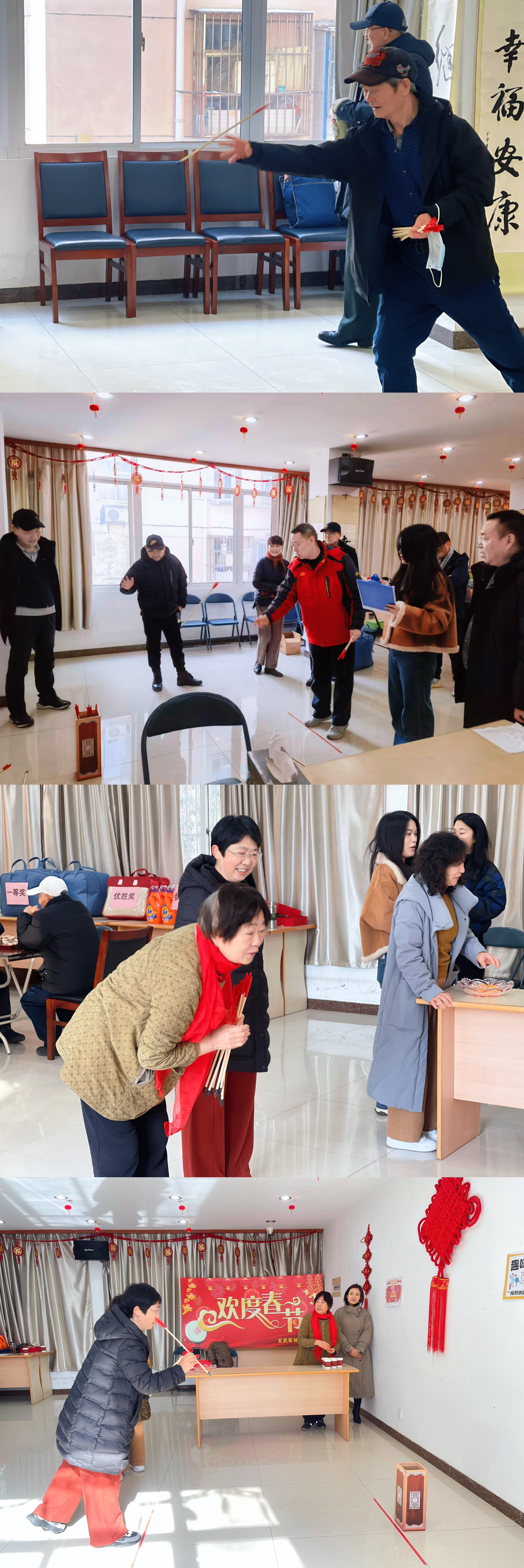 游艺活动区同样热闹非凡。投壶项目让大家体验了一把古人的雅趣,老干部们屏息凝神,瞄准投掷,每当有人投中,都会引来一阵热烈的掌声。弹乒乓球项目则考验着大家的手眼协调能力,乒乓球在桌面上跳跃,承载着满满的欢乐。