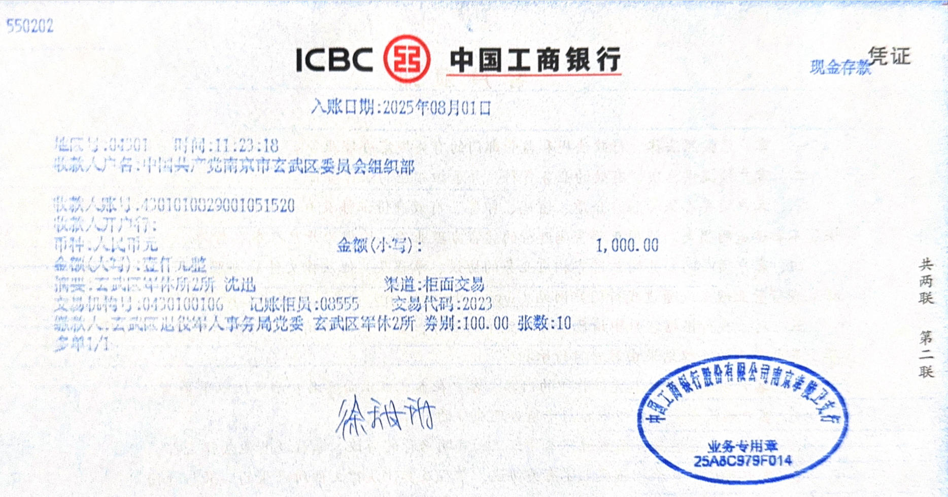 多年来,沈迅同志多次自愿向党组织缴纳大额党费、积极参加慈善捐款的善行义举,在全所广为传颂。今年“八一”节当天,沈迅又托女儿专程将1000元现金作为大额党费交到二所党总支负责人手上,还附上一张亲笔字条表达对党的炙热告白。二所党办主任随即按照大额党费上缴流程去银行办理了相关业务,办好业务后,在电话中及时向沈老表达感谢并告之办理情况。