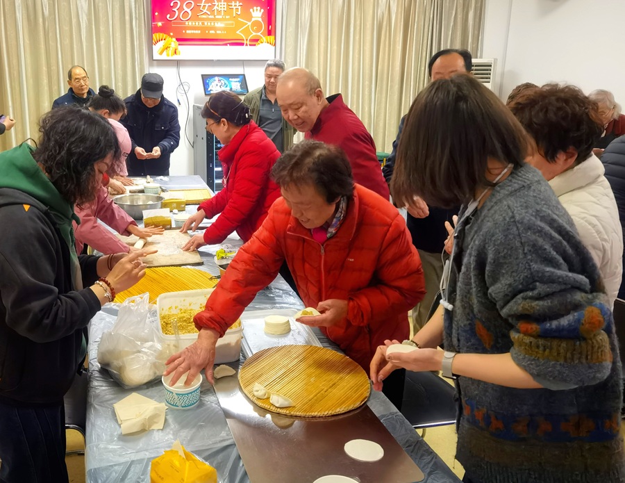 二是,包饺子体验生活。在王建所长的带领下,工作人员预先准备了面团、饺皮和菜肉馅。擀皮包饺是女军休干部们的拿手活。只见她们组合自由,动作熟练,有擀皮的,包饺子的,煮饺子的,端送热饺子的,现场一派忙碌景象。大家在欢声笑语中,分享与品尝着自己劳动的成果。